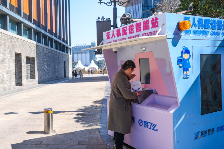 2月28日,市民在位于宁波市江北区老外滩的一处无人机配送智能站接收由无人机配送的外卖。